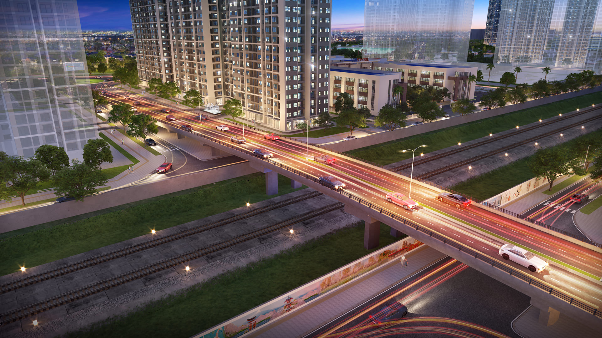 5 phút: Tiếp cận Vincom Mega Mall, Vườn Nhật Zen Park và Bệnh viện Vinmec qua trục đường nội khu 30m.